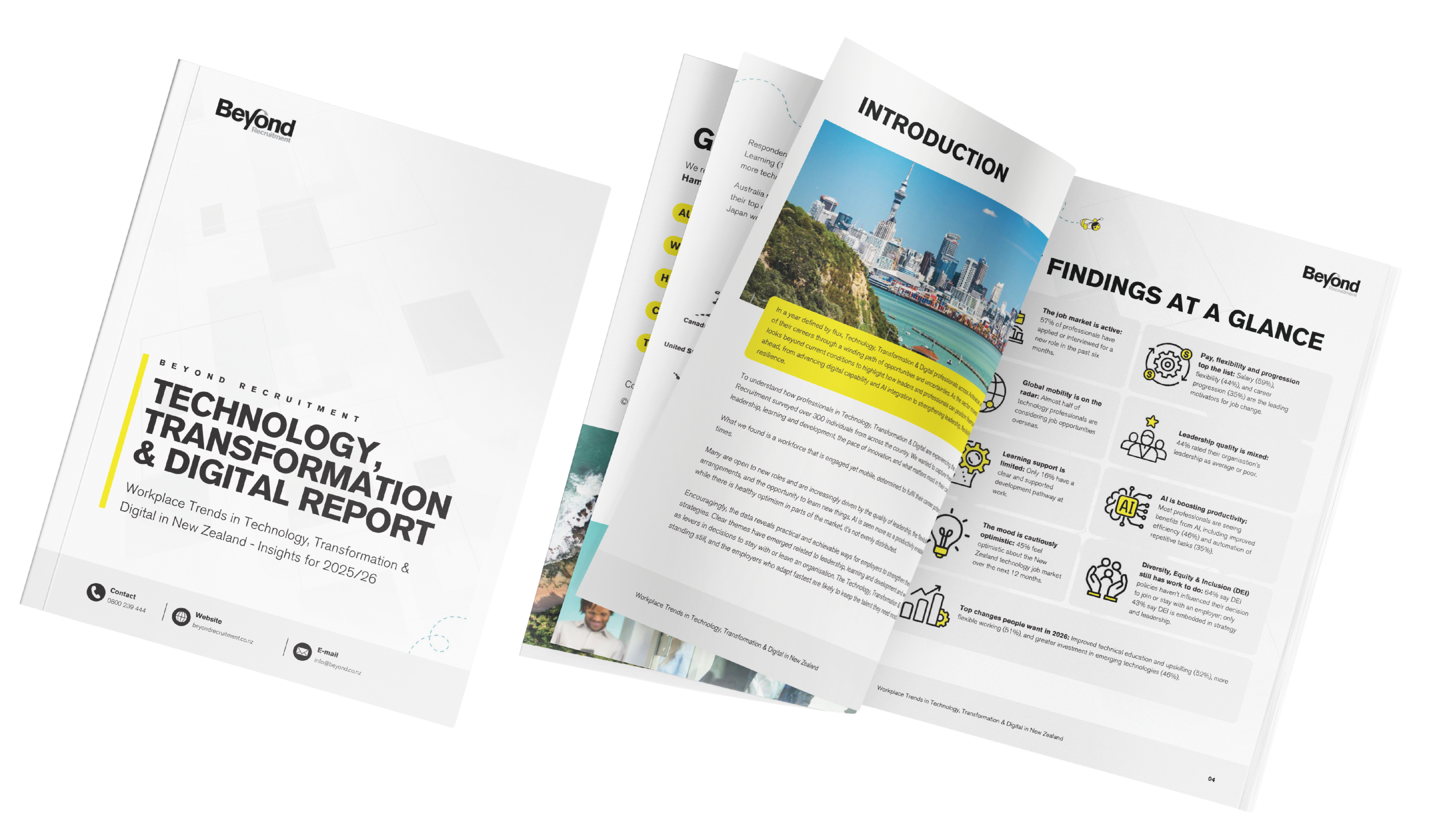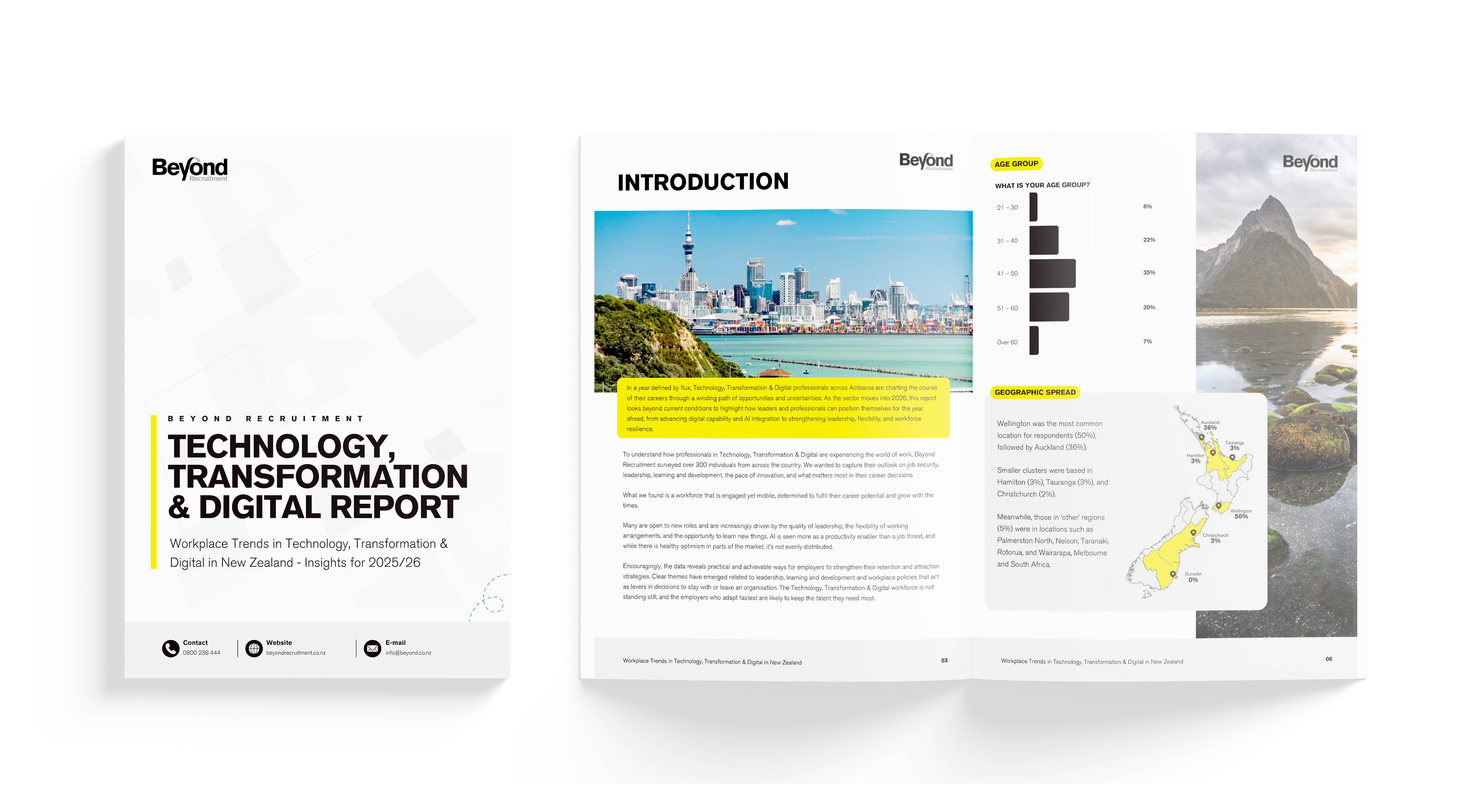 The Beyond Recruitment Technology, Transformation and Digital Report 2025/26 explores the trends, motivations and challenges shaping the industry. Based on insights from more than 300 professionals nationwide, this report reveals how leadership quality, learning and development, AI adoption and flexible working are influencing attraction and retention across Aotearoa’s digital workforce.